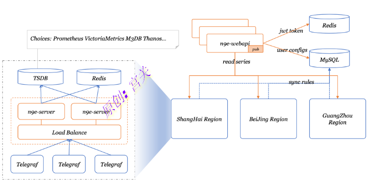 - server:告警引擎和数据转发,接收telegraf、grafana-agent、Datadog-Agent等上报的数据,写入时序数据库,并周期性从MySQL中同步告警规则,与从时序数据库查询的数据进行匹配,满足阈值触发告警,将告警事件推送到redis,每套server对应一个redis