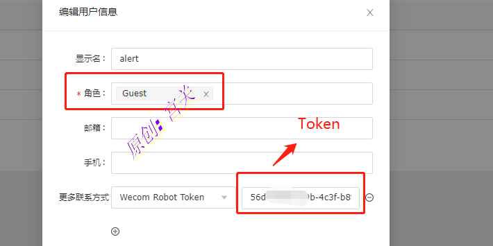 5、在夜莺主界面的用户管理界面,创建一个角色类型为Guest的虚拟用户,选择企业微信,填写Webhook的Token信息,如图: