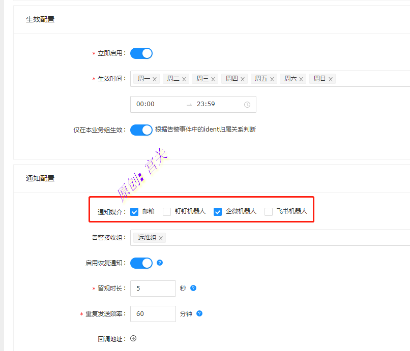 2、生效配置和通知配置根据自己的实际情况进行配置,如图: