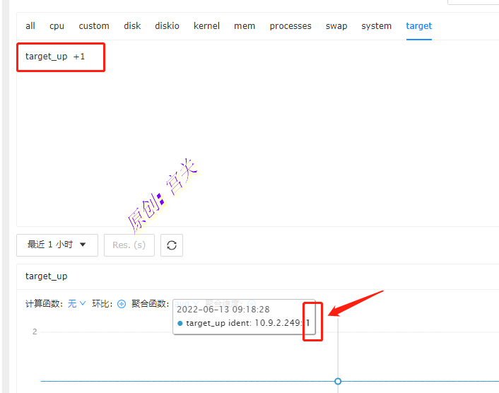 target_up是夜莺自带的一个监控指标,用于判断采集客户端(例:telegraf)是否存活,如采集客户端在持续上报监控数据,target_up的值就显示为1,如果采集客户端不再上报监控数据了,target_up的值就变成0,所以,如图: