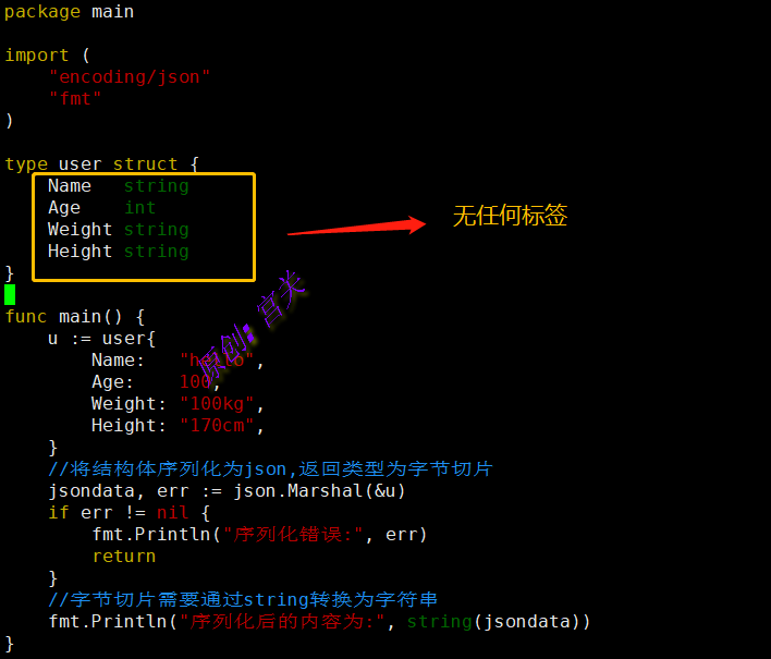 1、首先看一个没有任何标签的结构体序列化为json的例子,如图:
