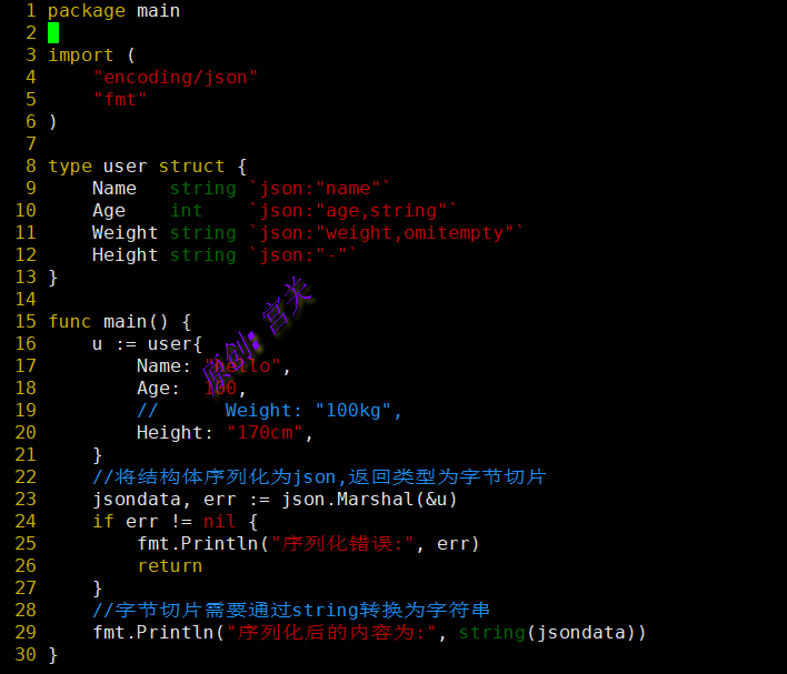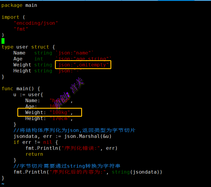 从上图看出,Name和Age都转换为了小写格式,并且Age的类型从int转为了string,Weight设置了omitempty,并且实例化结构体时候没有指定此字段,因此不显示,Height设置为”-“,默认就不参与序列化