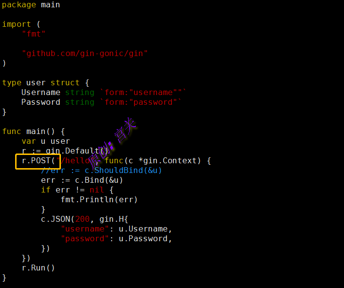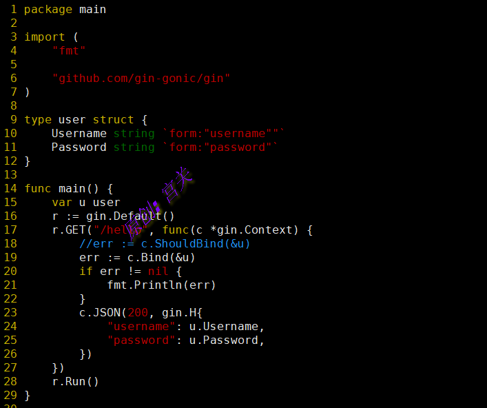 - 第15行:定义结构体user,字段名字必须要大写,通过form标签指定字段名,字段名和form之间不可以有空格