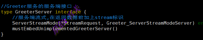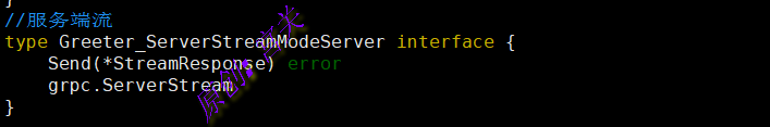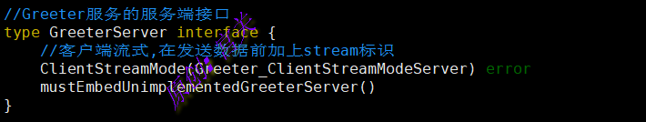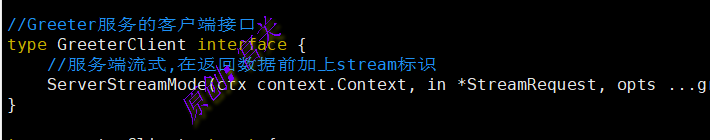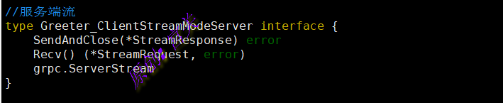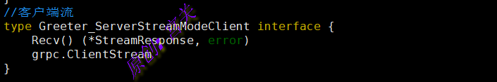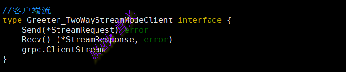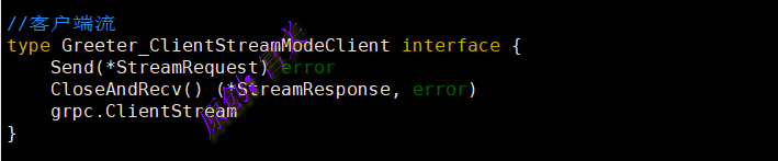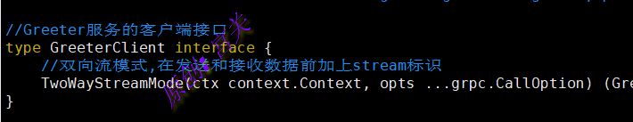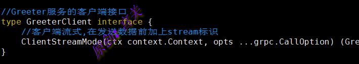 • 客户端ClientStreamMode方法第一个返回值为Greeter_ClientStreamModeClient(截图不全因此看不到),表明生成一条流,用于发送和接收message,如果有多个方法,则每个方法各自生成一条流