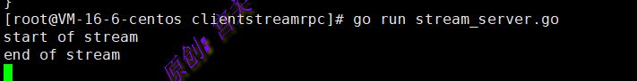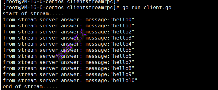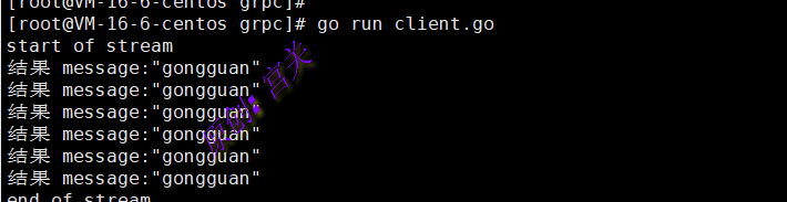 • 主函数里通过for循环接收来自服务端的响应message。当客户端主动关闭流,服务端在返回最后一个响应message后客户端通过Recv方法会得到返回值io.EOF(标志着整个流的结束)