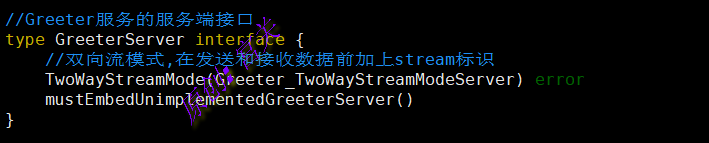 • 服务端TwoWayStreamMode方法的入参是Greeter_TwoWayStreamModeServer(流),具体方法需要用户自行实现,可以从流中发送和接收message