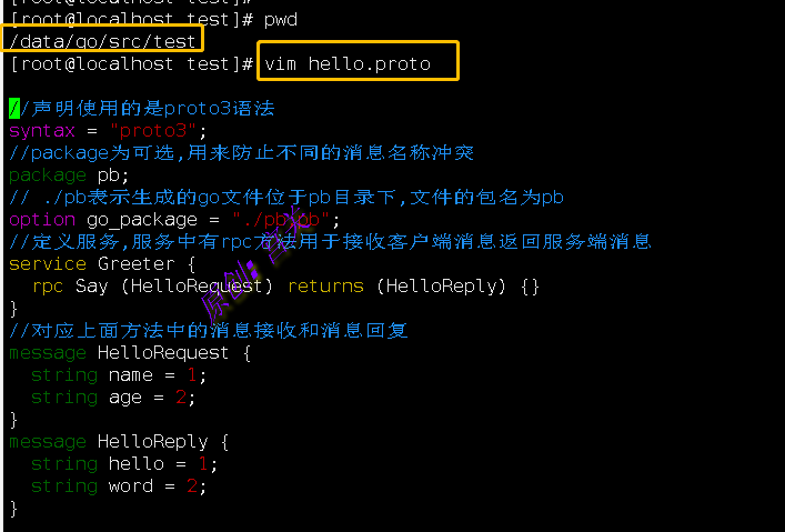 message是关键字,会将message定义的字段转换为HelloRequest和HelloReply结构体。注意,后面的1、2不是赋值,而是在定义这个变量在这个message中的位置,如果有多个就继续写1、2、3、4、5等