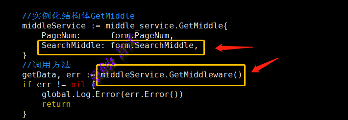 2、实例化中间件服务结构体,并给字段赋值,调用方法获取中间件数据,如图: