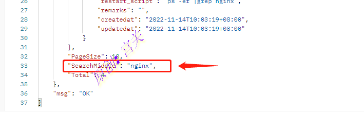 上面代码中通过两个Where来判断条件,第一个为获取数据的id信息,根据PageNum和PageSize,第二个Where为筛选条件,当ip_address或者middleware_name等于搜索的字段为条件,@serchmiddle为变量,sql.Named中指定变量并设置值,这个值就是传递过来的数据,sql.Named为固定写法,例如:我们输入要搜索的中间件名为nginx ,页数PageNum为第一页,那么在查询数据库的时候,就是查找当middleware_name为Nginx的数据,查找后从id为0开始获取10条数据