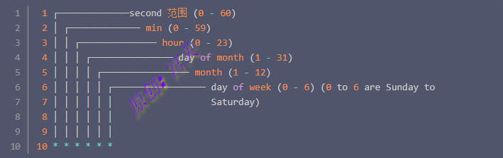 与linux的crontab大致相同,但是比crontab多了第一个参数second,表示秒, crontab的定时任务分为”分、时、日、月、周”,cron的定时任务分为”秒、分、时、日、月、周”