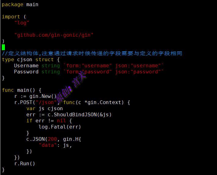 下面例子中发送POST请求,传递JSON数据,并绑定到结构体中,如图: