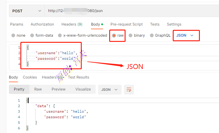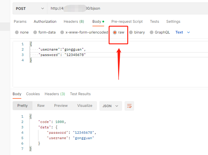 通过postman请求,选择raw,然后定义JSON数据,如图: