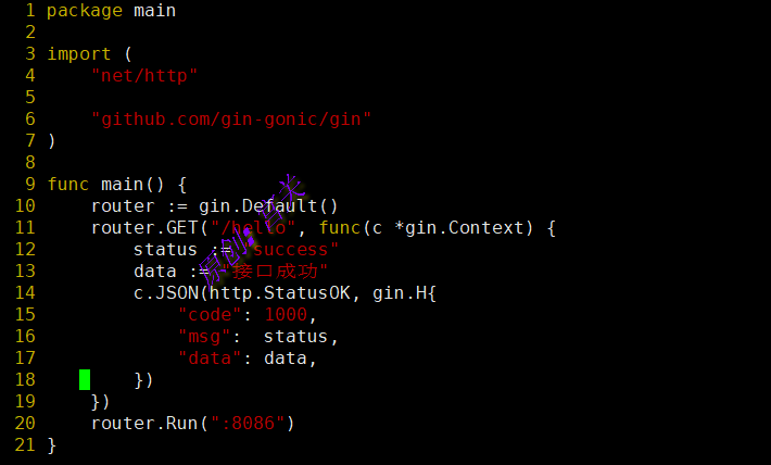 - 第10行:初始化一个gin引擎,除了Default外还可以通过gin.New(),二者区别:gin.Default()里面调用了gin.New();在调用完gin.New()得到Engine 实例后,还调用了engine.Use(Logger(), Recovery());gin.Default()获取到的Engine 实例集成了Logger 和 Recovery 中间件