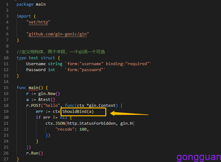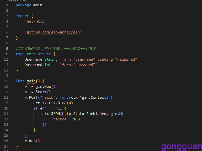 下面例子表示通过Bind()方法将数据绑定到结构体test上,Username为必选字段,Password为可选,ctx.JSON中的第一个参数设置为http.StatusForbidden,表示状态码为403,如图:
