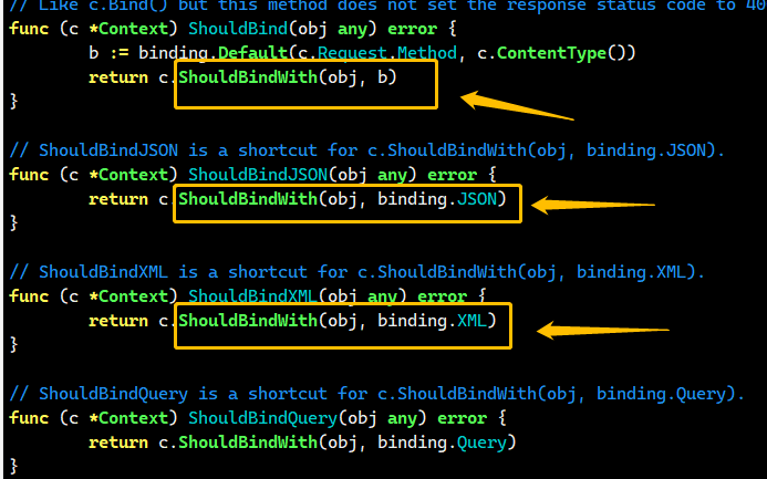 ShouldBindWith()方法是ShouldBind、ShouldBindJSON、ShouldBindXML等这些绑定方法的底层方法,如图: