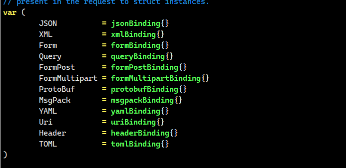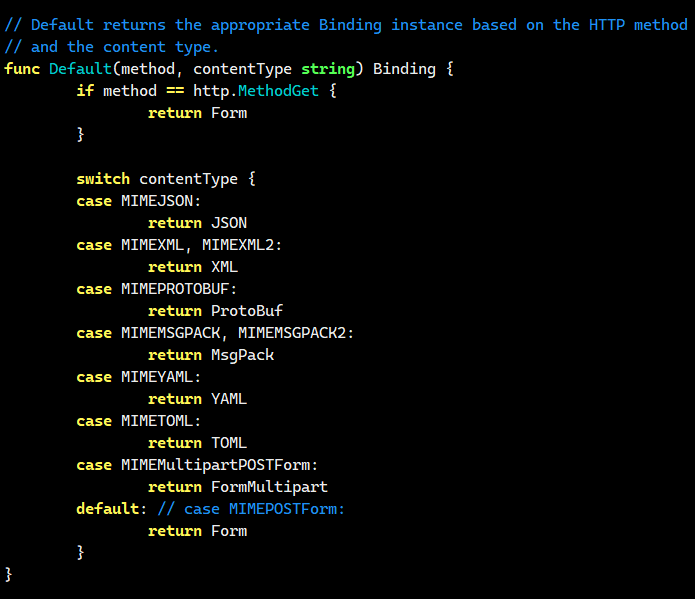 从上图的switch-case中看到,如果没有指定任何常量,那么默认情况下返回Form,也就是表单绑定,因此ShouldBind()默认情况下实现的就是表单绑定