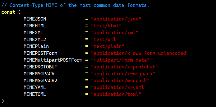 从上图看出,如果请求的方法为GET,那么直接返回Form,也就是表单绑定,如果不是GET,也就是POST,此时就要判断contentType了,根据客户端传递的contentType不同,返回不同类型,MIMEJSON表示常量,已经在binding.go中定义,如图: