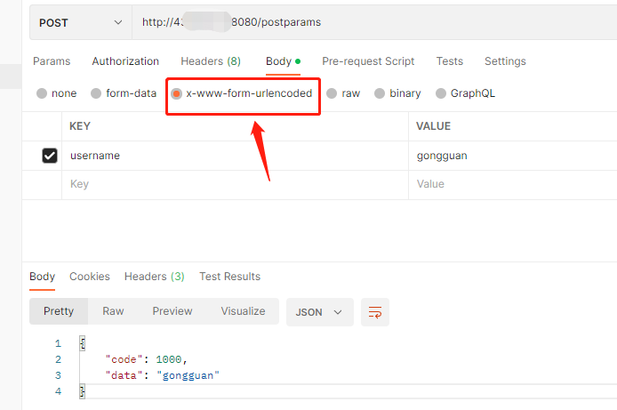 注意:通过Body方式来传递参数要选择x-www-form-urlencoded,x-www-form-urlencoded适用于传输简单的键值对数据,还有一种是通过url传递参数,此时就要选择Params了