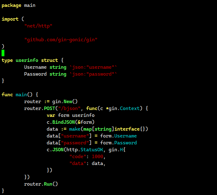 注:在使用ShouldBindJSON时,结构体标签form可写可不写,在使用postman请求的时候,password字段后不能有逗号,否则不符合json格式,会报错的