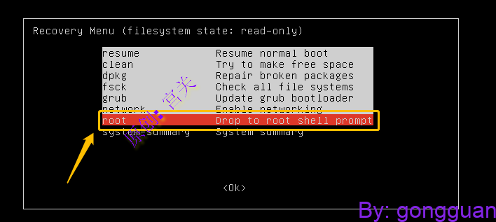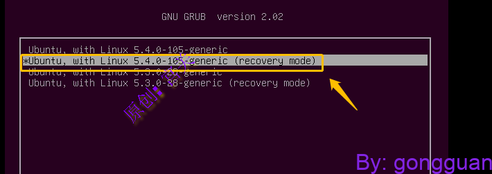 ubuntu重置密码 guan 2月 14, 2023 150 0 本例子中以vmware虚拟机为例子 1、首先打开虚拟机,打开后长按shift键(打开一瞬间就要长按),选择Advanced位置,如图: 2、回车后,选择recovery mode位置,如图: 3、回车,在打开页面,选择root Drop to root shell prompt<如图: 下面这个位置直接回车即可,如图: 4、通过passwd重置用户密码,用户必须存在,不存在需要新建,如图: 最后reboot即可 赞微海报分享