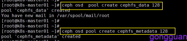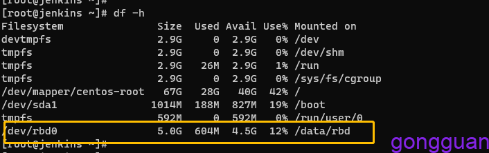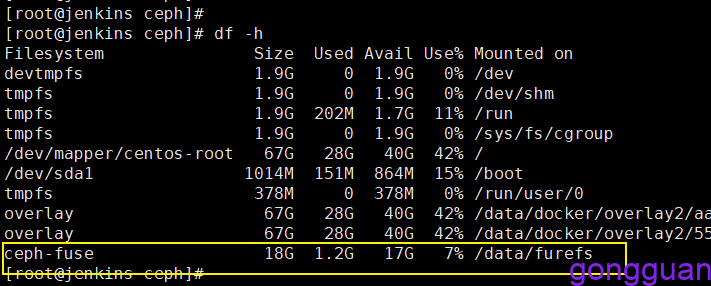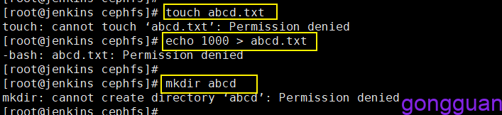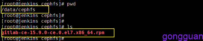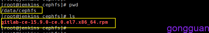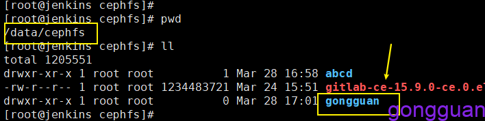 我们在通过admin用户在根目录下创建一个文件夹gongguan,再次回到上图中的挂载机器路径下/data/cephfs可以看到此目录,如图: