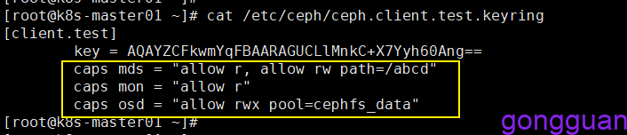 ceph auth get-or-create client.test mon 'allow r' mds 'allow r,allow rw path=/abcd' osd 'allow rw pool=cephfs_data'