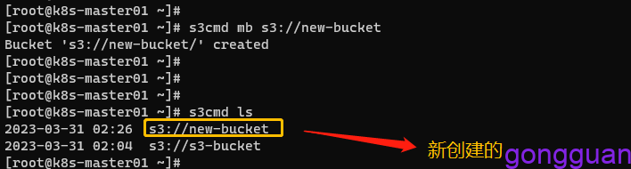 s3cmd mb  s3://new-bucket                 #创建存储桶