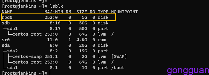 再次通过lsblk查看映射后的机器磁盘情况,多了一个rbd0,如图: