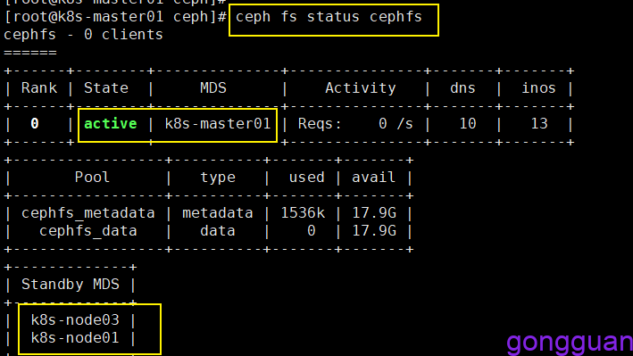 查看cephfs状态,可以看到一个为活跃状态,两个为备份状态,如图: