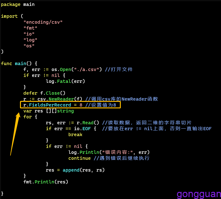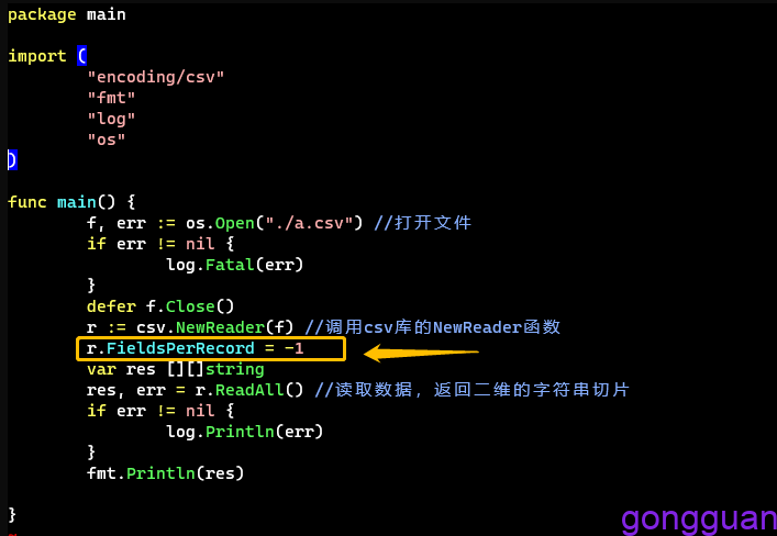 有时候的csv文件并不都是像上面的那样整洁干净,可能很乱,此时可以通过reader.FieldsPerRecord来处理,FieldsPerRecord说明如下: