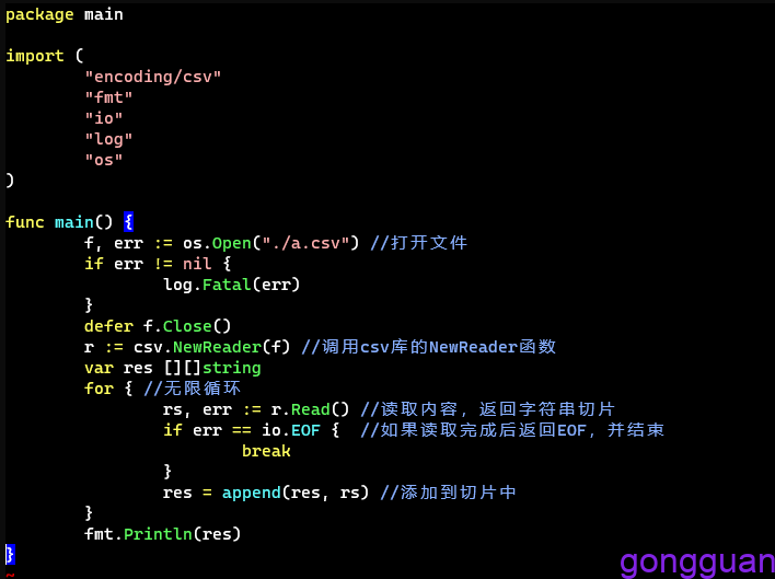 • 通过for无限循环以及Reader结构体的Read()方法读取内容,返回字符串切片