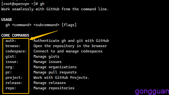 4、直接输入gh,即可看到常用的命令,如图: