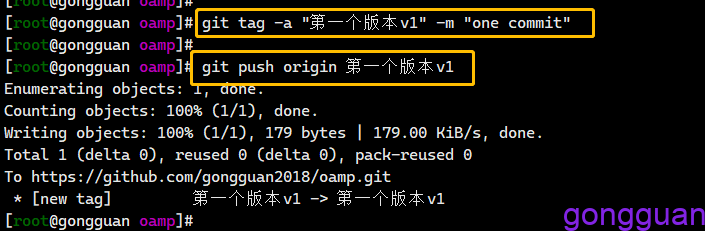 标签可以理解为对于某次commit的一个标识,相当于起了一个别名,这个在github中创建release中很有用,因此在github中创建release是需要tag的,上面我们commit的时候用的是one commit,因此针对这个标识打一个标签,如下: