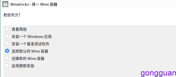 4、上面直接选择默认的wine容器,然后点击确定,弹出一个类似帮助信息,选择否,如图: