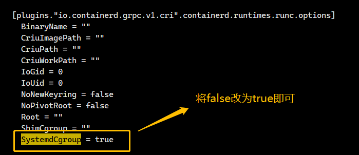 3、修改/etc/containerd/config.toml,配置 systemd cgroup 驱动,如图: