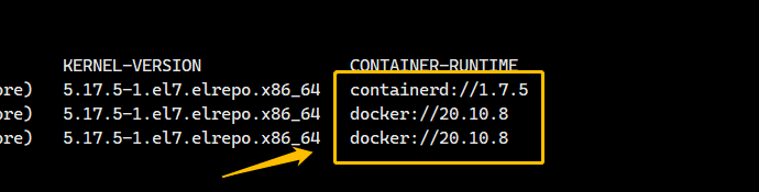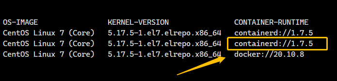 执行kubectl get nodes -o wide可以查看当前使用的runtime,如图: