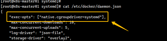 对于docker配置systemd驱动,需要编辑配置文件/etc/docker/daemon.json,如图: