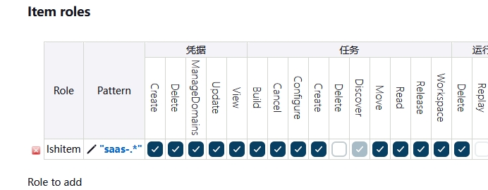 在Items Roles位置,添加项目角色,匹配saas-.*,表示匹配全部已saas-开头的项目,如图: