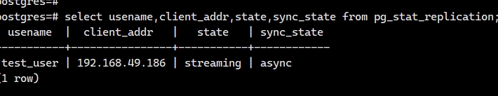 3、登录主节点,在postgresql命令行查看从库状态,如图: