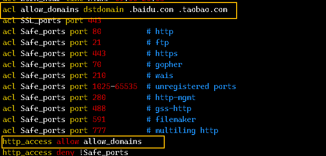 5、允许访问指定域名,allow_domains可以自定义,最重要的是http_access后面改为allow,如图: