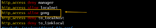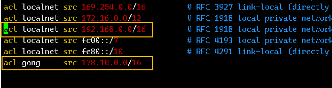 因为在http_access规则中,多个ACL名称默认是逻辑与的关系,而不是逻辑或,因此如果同时定义了localnet gong,那么就要求你的客户的IP同时要是192.168网段和178.10网段的才行,必须同时满足,否则这条规则就不生效了,因此可以针对gong这个名称单独指定http_access规则,如图: