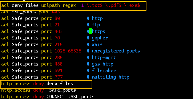 acl deny_files urlpath_regex -i \.txt$ \.pdf$ \.exe$