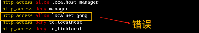 如果将localnet和gong都定义在http_access是错误的,如图: