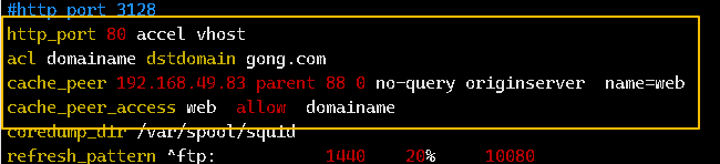 上述配置可以理解为:域名请求到达squid后,实际请求到49.83:88端口的服务上去,如果有多个域名就要配置多个规则,请求的域名需要能解析到squid所在的服务器IP才行