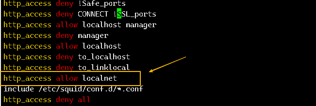 注:localnet这个名字可以自定义的,写完acl后还需要在后面添加http_access allow localnet表示允许localnet使用代理,http_access deny all要写在后面,否则localnet不生效,如图: