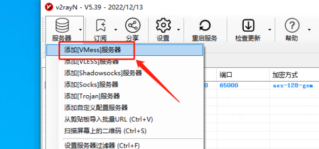 2、双击v2rayN.exe,打开客户端–右下角点击一下图标即可打开,然后点击添加vmess服务器,如图: