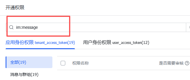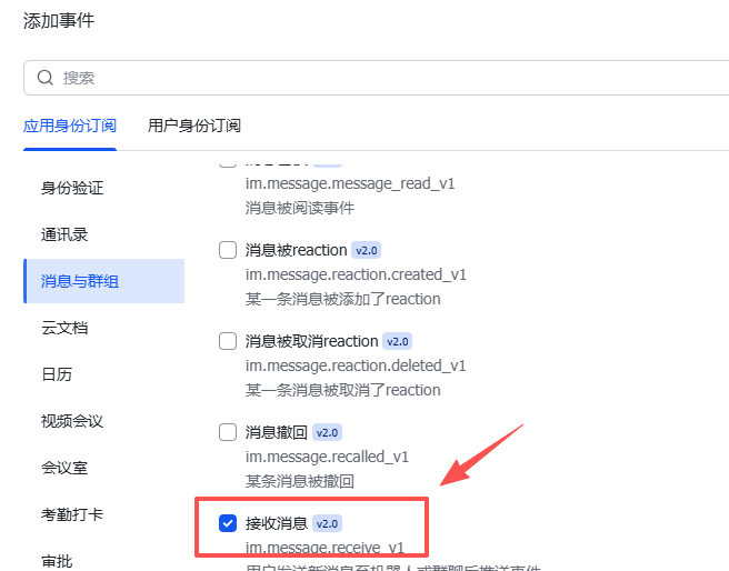 事件添加完成之后,还需要开通权限,搜索以下权限全部勾选,如图: