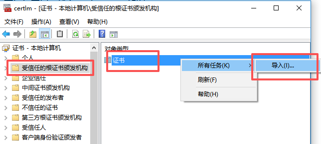 5、将第一步生成的rootCA.pem文件下载出来,导入windows本地证书信任机构中,这样才不会提示不安全,如下: